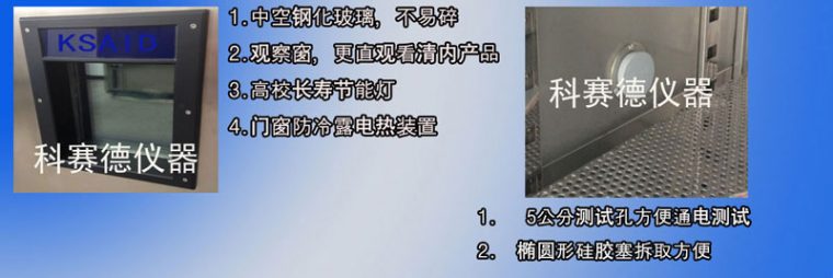 恒溫恒濕試驗機在做低溫測試(-40℃)時工作室的溫度是遠遠低于周圍的環境溫度的,里面面冷,外面熱,工作室的空氣中的水蒸汽碰到玻璃直接凝華(氣體直接變固體)形成冰霜,妨礙視線,也增加了安全隱患。所以為了解決這個問題,科賽德儀器的恒溫恒濕試驗機上面采用的都是防霧視窗玻璃,采用多層玻璃中空鋁條組合而成,玻璃中間層填充了惰性氣體,原理作用跟真空玻璃杯子類似,然后玻璃上面還安裝了加熱帶,一般試驗箱開始制冷后玻璃的加熱帶也開始通電開始加熱,以達到自動除霧和隔熱作用。