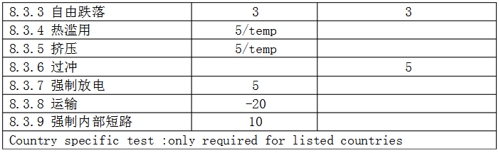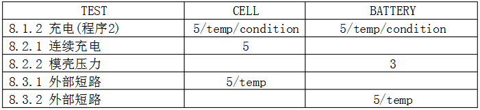 B)測試:一個完全放電的電芯能夠承受1ItA的電流反充電90min. C)接受條件:不起火,不爆炸。 8詳細要求和測試(鋰系列)